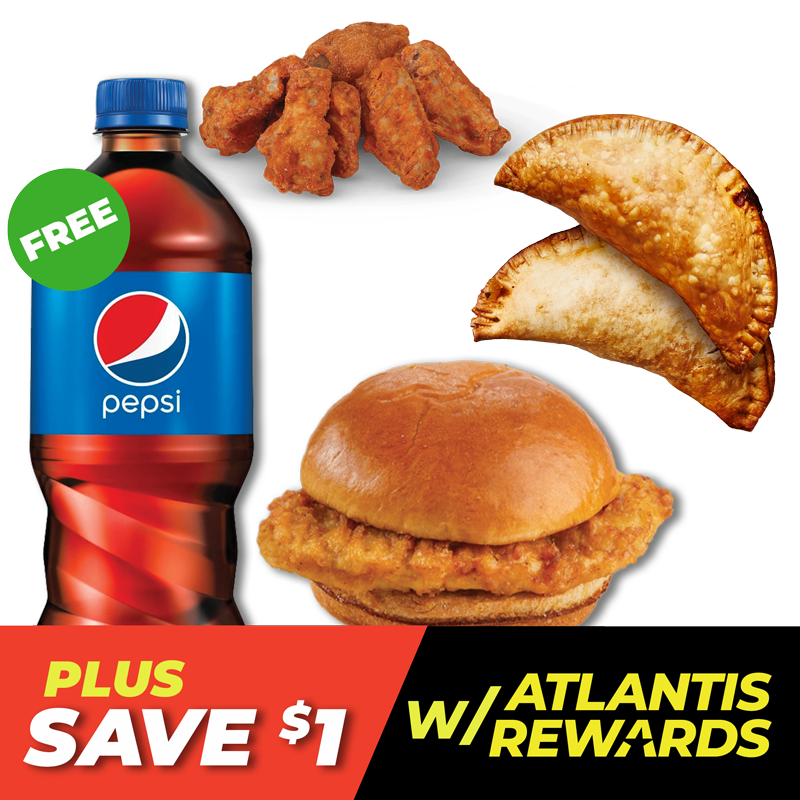 FREE 20 oz Pepsi product when you buy our new Tyson Spicy or Original Chicken Sandwich or two Empanadas of any flavor, or six BBQ or Hot Chicken Wings.
